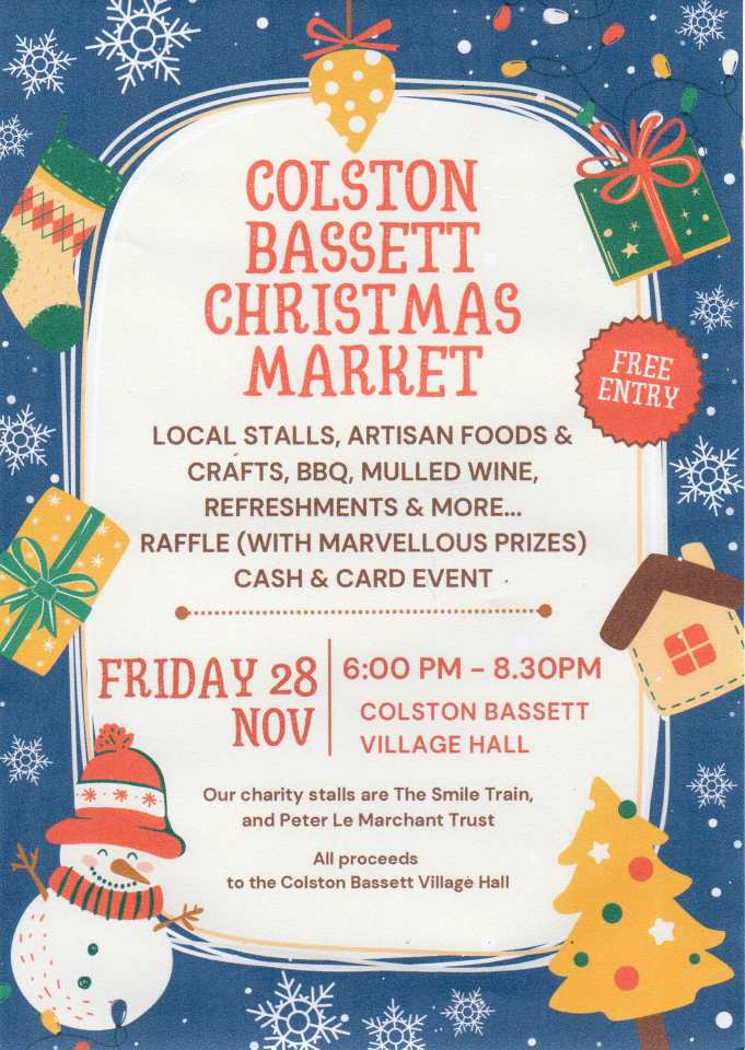 You may be interested to know about the upcoming Christmas Market being held at Colston Bassett Village Hall on Friday 28th November 2025, from 6:00pm to 8:30pm. The market will feature a variety of local stalls offering artisan foods and crafts, along with a barbecue, mulled wine, and other refreshments. A raffle will also be held. Both cash and card payments will be accepted. Charity stalls this year will be supporting The Smile Train and the Peter Le Marchant Trust. All proceeds from the evening will go towards supporting Colston Bassett Village Hall, which our school uses regularly.